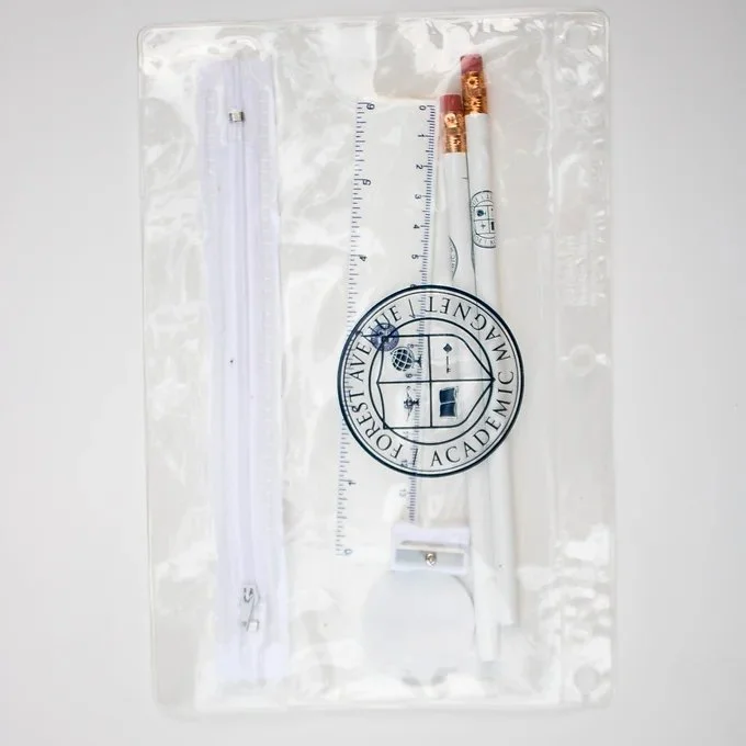 SPIRIT STORE › CREST PENCIL BAG Image 1 of 5 Image 2 of 5 Image 3 of 5 Image 4 of 5 Image 5 of 5 CREST PENCIL BAG Sale Price: $2.00 Original Price: $5.50 This pencil bag comes complete with an eraser, two pencils, and a ruler. Add To Cart Added! This pencil bag comes complete with an eraser, two pencils, and a ruler.
